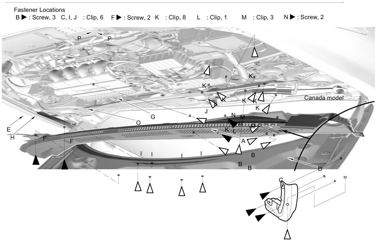 NOTE: To release the clips (C, I, J), pry up on the center pin at the notch (P).