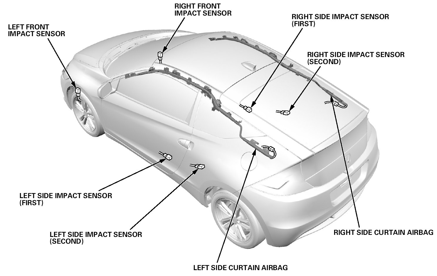- The SRS unit (including the safing sensor and the impact sensor) is located under the dashboard and the side impact sensors are located in each side sill and rear wheel arch. The front impact sensors are located behind the right and left ends of the front bumper. Avoid any strong impact with a hammer or other tools when repairing the front side frame, the lower part of the dashboard, the side sill, and the rear wheel arch. Do not apply heat to these areas with a torch, etc.