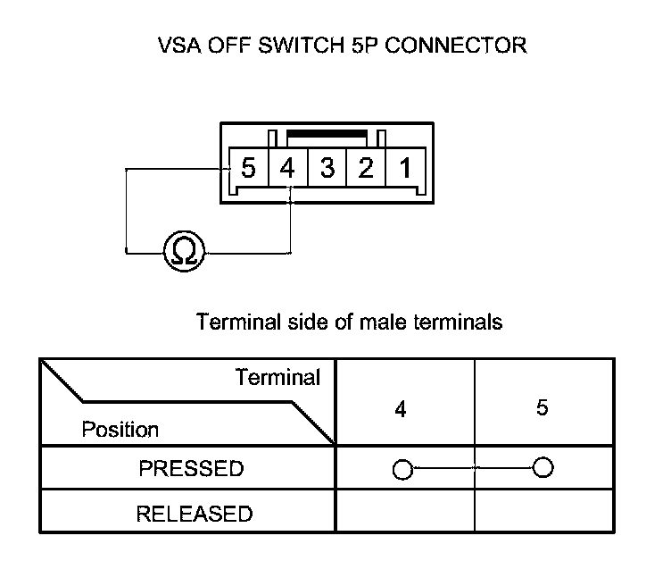 4. On the switch side, check for continuity between the VSA OFF switch 5P connector terminal in each switch position according to the table.