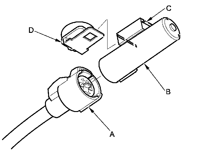 4. Lift the tab (C) to release the lock, then remove the outside air temperature sensor from the clip (D).