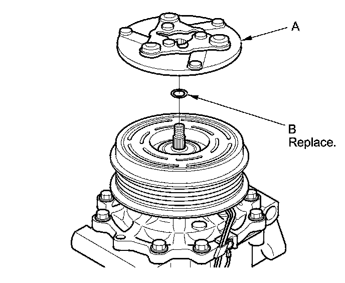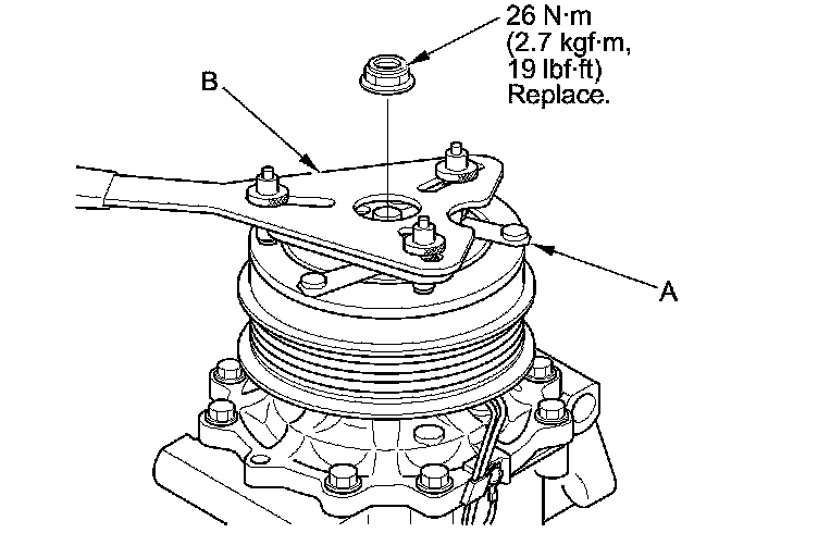 1. Remove the center nut while holding the armature plate (A) with the A/C clutch holder (B).
