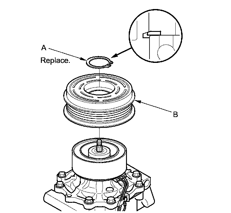 3. If you are replacing the field coil, remove the snap ring (A) with snap ring pliers, then remove the rotor pulley (B). Be careful not to damage the rotor pulley and A/C compressor.