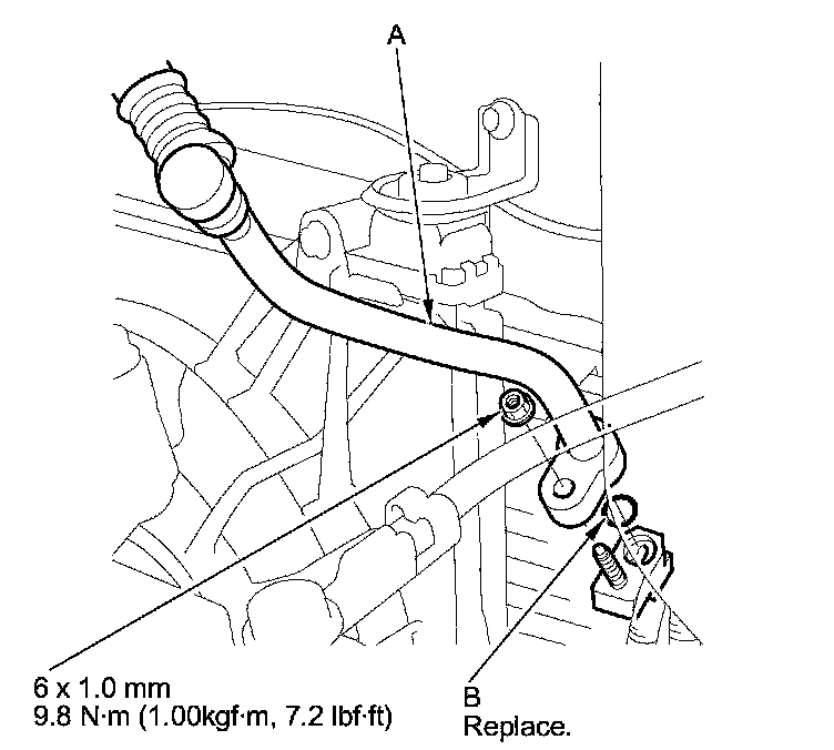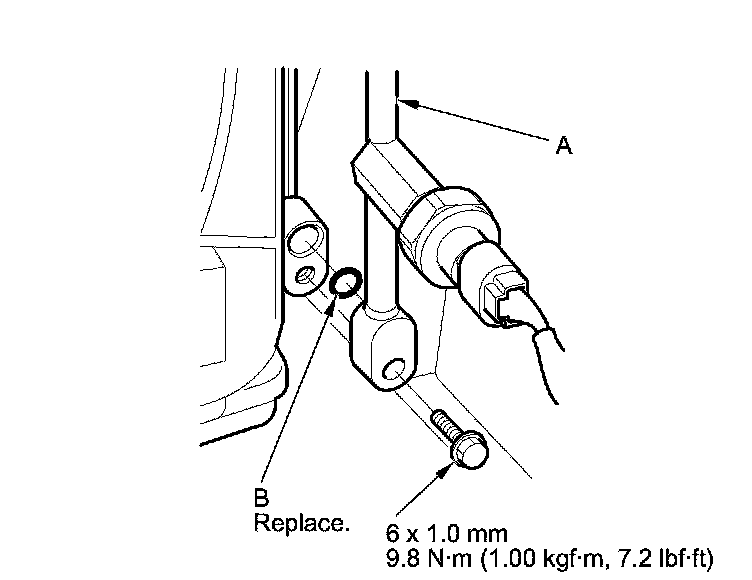 7. Remove the bolt, then disconnect the receiver pipe (A) from the A/C condenser. Remove the O-ring (B) from the receiver pipe.