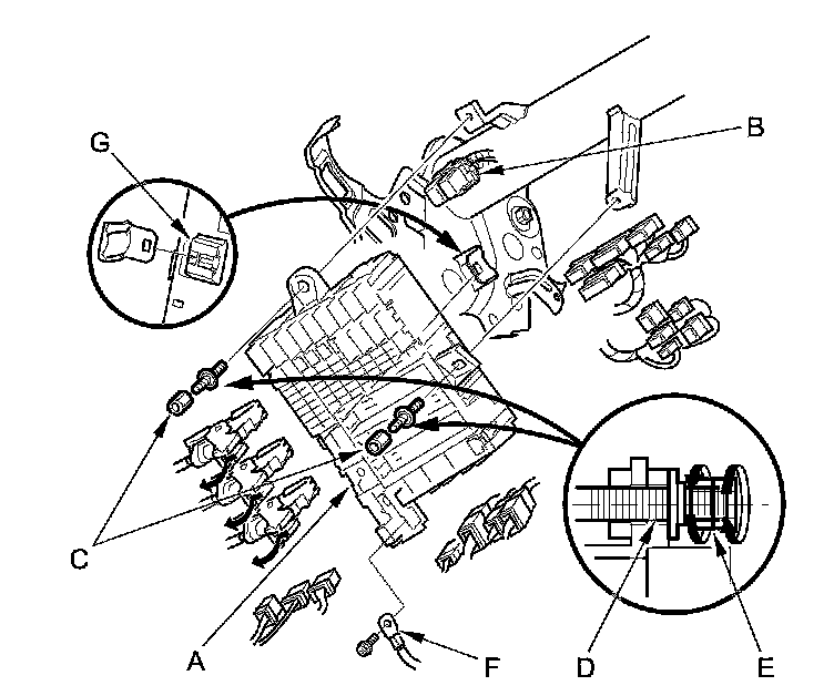 6. Release the lock (G), and pull the fuse/relay box away from the body.