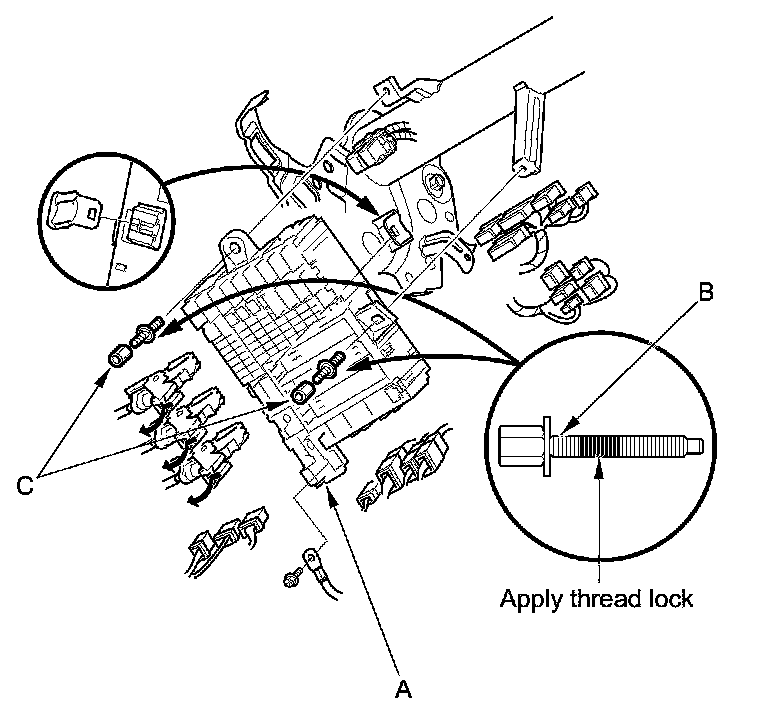 3. Disconnect the connectors from the front side of the under-dash fuse/relay box (A).