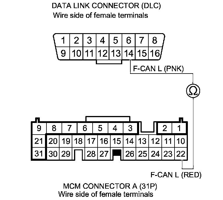 23. Check for continuity between MCM connector terminal A22 and DLC terminal No. 14.