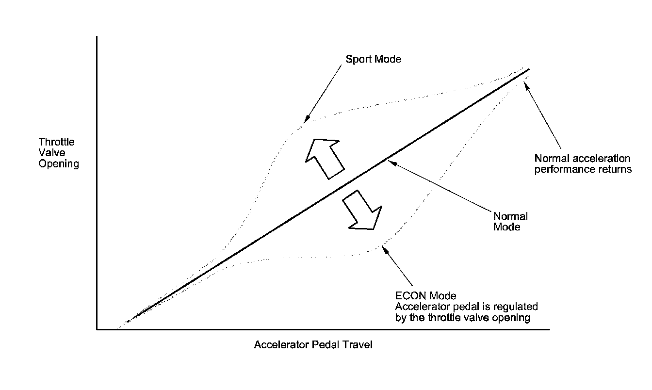 Normal mode: This mode is a balance between driving performance and fuel economy. When you start the engine, the vehicle is in Normal mode. ECON mode: This mode provides the best fuel economy. If the accelerator is pressed quickly, the ETCS (electronic throttle control system) keeps the throttle response steady and smooth. Sport mode: This mode offers increased accelerator response.