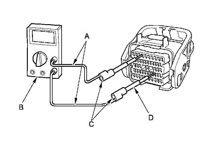 4. Connect one side of the patch cord terminals (A) to a commercially available digital multimeter (B), and connect the other side of the patch cord terminals (C) to a commercially available banana jack (Pomona Electronics Tool No. 3563 or equivalent) (D).
