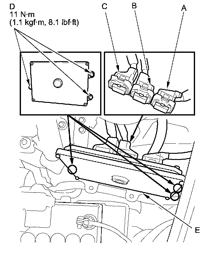 12. Disconnect ECM/PCM connectors A, B, and C, then remove the ECM/PCM (E).