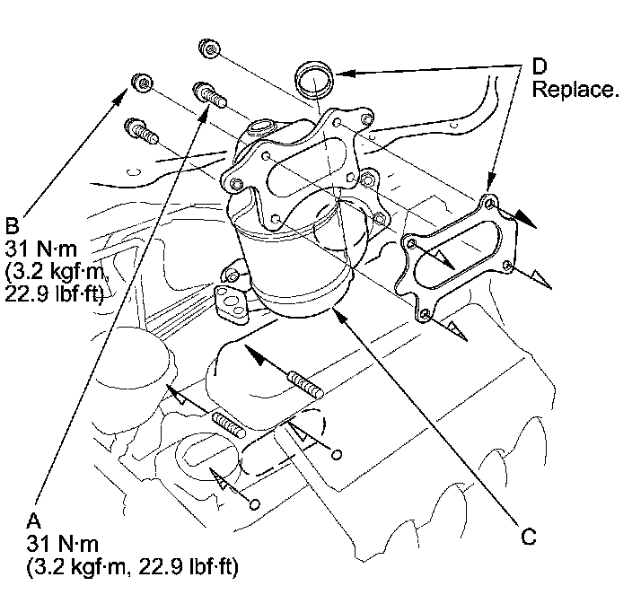 9. Install the parts in the reverse order of removal with new gaskets (D).