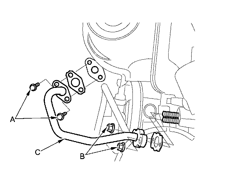2. Install the EGR pipe to the TWC side, tighten the bolts (C) by hand with a new gasket (D), then torque the bolts.