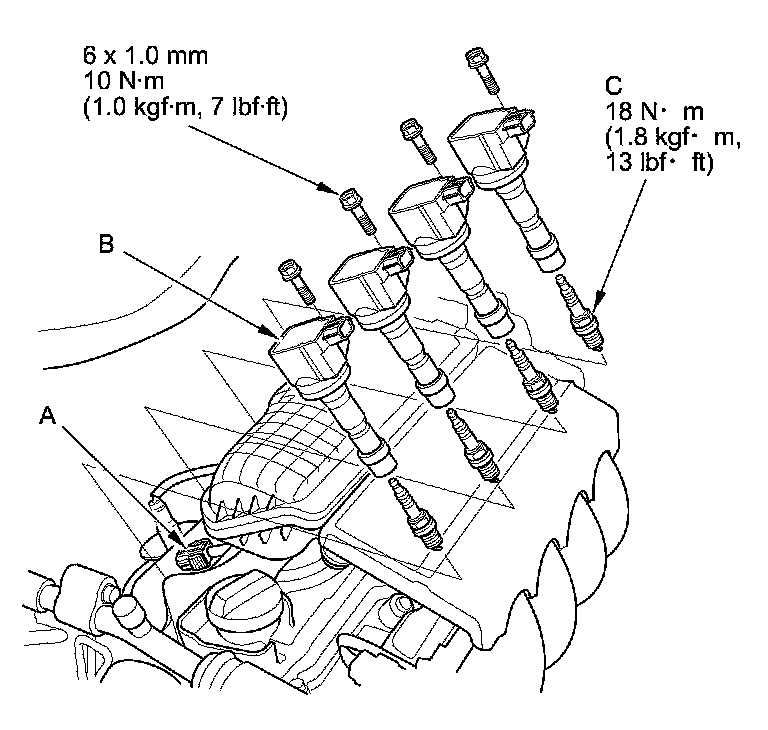 2. Disconnect the ignition coil connectors (A), then remove the ignition coils (B).