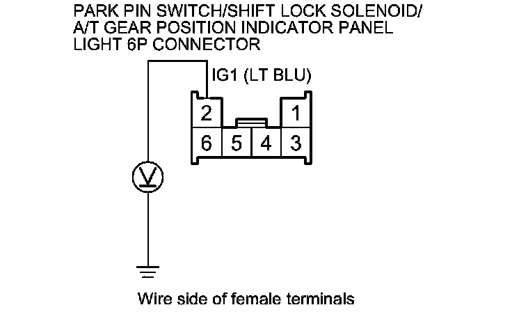 18. Release the brake pedal, and measure the voltage between park pin switch/shift lock solenoid/A/T gear position indicator panel light 6P connector terminals No. 2 and No. 6. The shift lever must be in P.