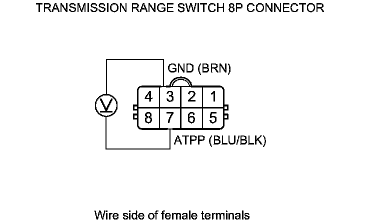 26. Measure the voltage between transmission range switch 8P connector terminals No. 3 and No. 7.