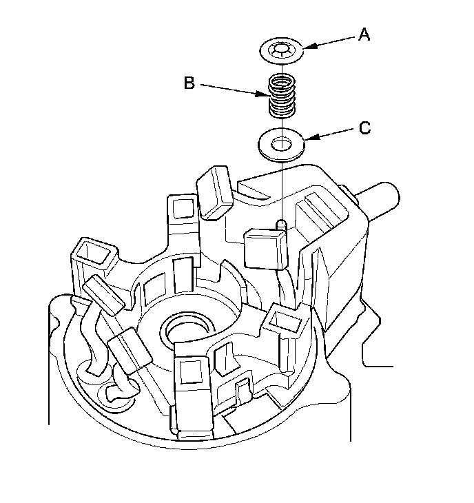 18. When the brush holder is replaced: Replace the brush holder set with the moving contact (A), the contact spring (B), and the push nut (C).