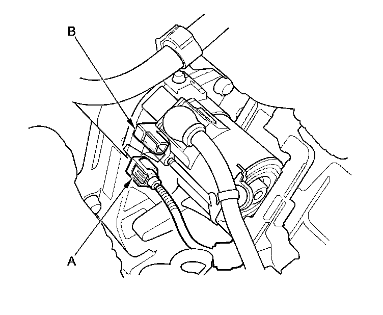 12. Make sure the shift lever is in neutral (M/T model) or P or N (CVT model), and set the parking brake, then disconnect the connector (A) from the starter S terminal (B). Connect a jumper wire from the battery positive terminal to the S terminal.