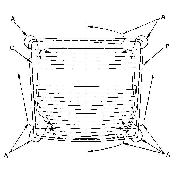 20. Pack adhesive into the cartridge without air pockets to ensure continuous delivery. Put the cartridge in a caulking gun, and run a bead of adhesive (A) to the upper rear window (B) along the edge of the rubber dams (C) and the lower seal (D) as shown: