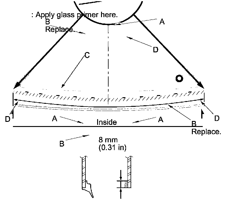 - Apply the glass primer to the corner areas of the upper rear window using the printed dots (D) on the upper rear window as a guide.
