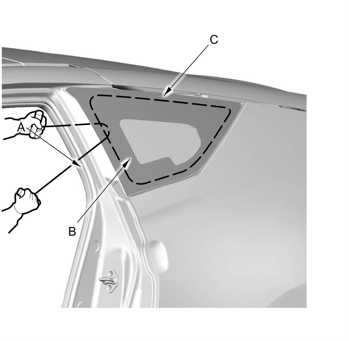 2. Remove the quarter glass molding (A) from the edge of the quarter glass (B). If necessary, cut the molding with a utility knife.
