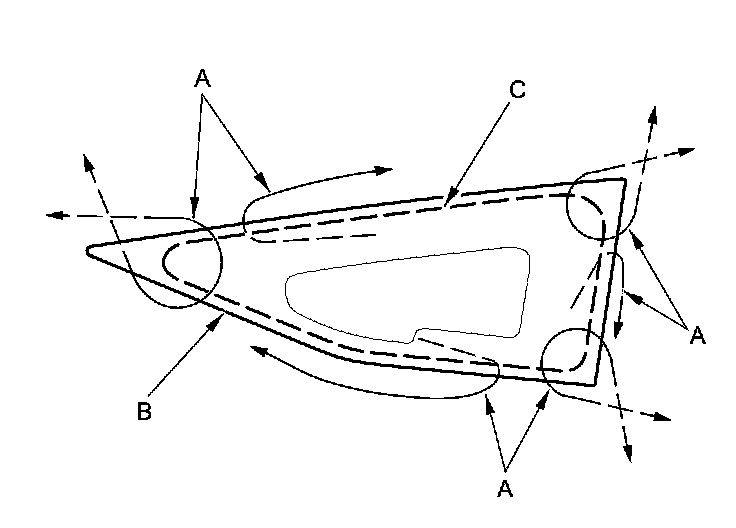 13. Apply a light coat of glass primer along the edge of the quarter glass (A), the molding (B), and the rubber dam (C) as shown, then lightly wipe it off with gauze or cheesecloth: