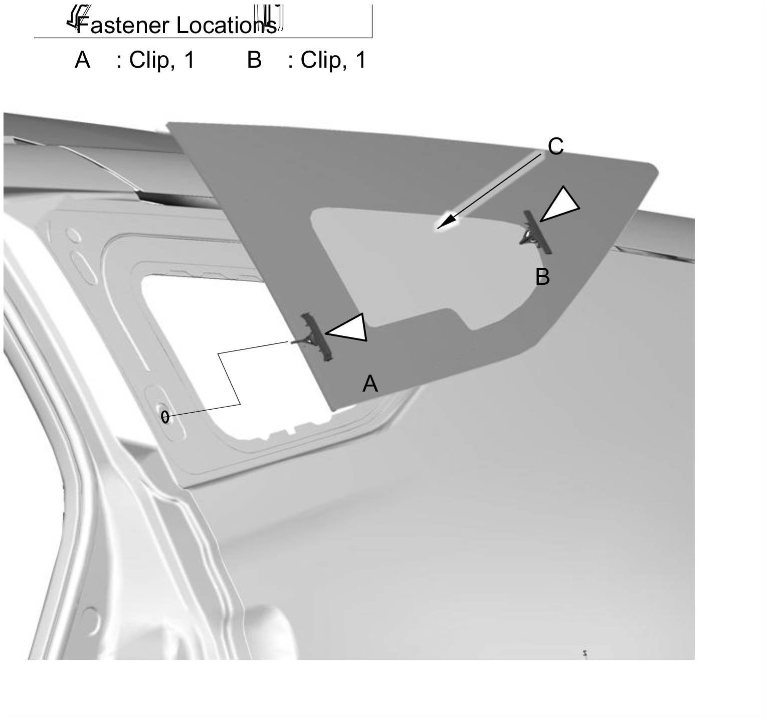 17. Hold the quarter glass (A) over the opening with suction cups, align it with the clips (B, C) and the fastener (D), and set it down on the adhesive. Lightly push on the quarter glass until its edges are fully seated on the adhesive all the way around.