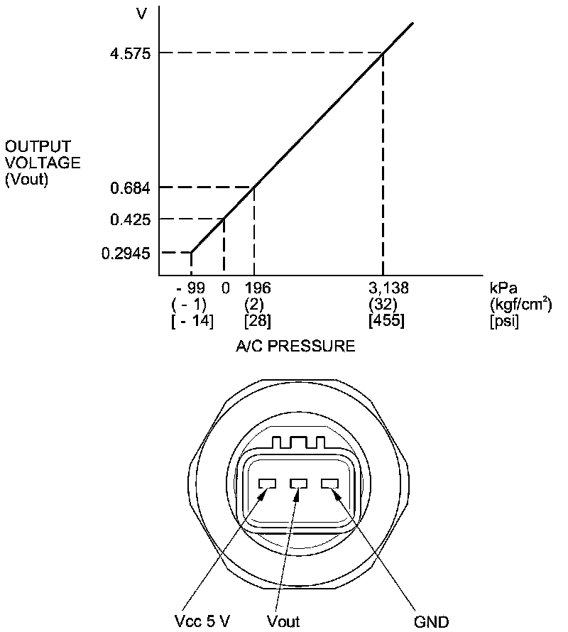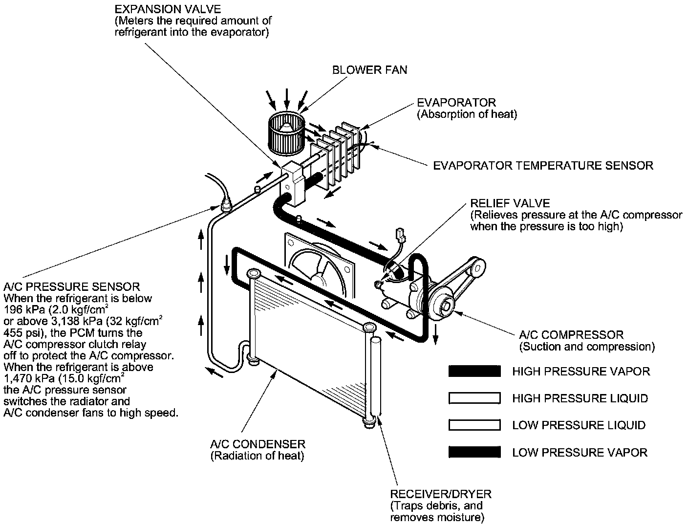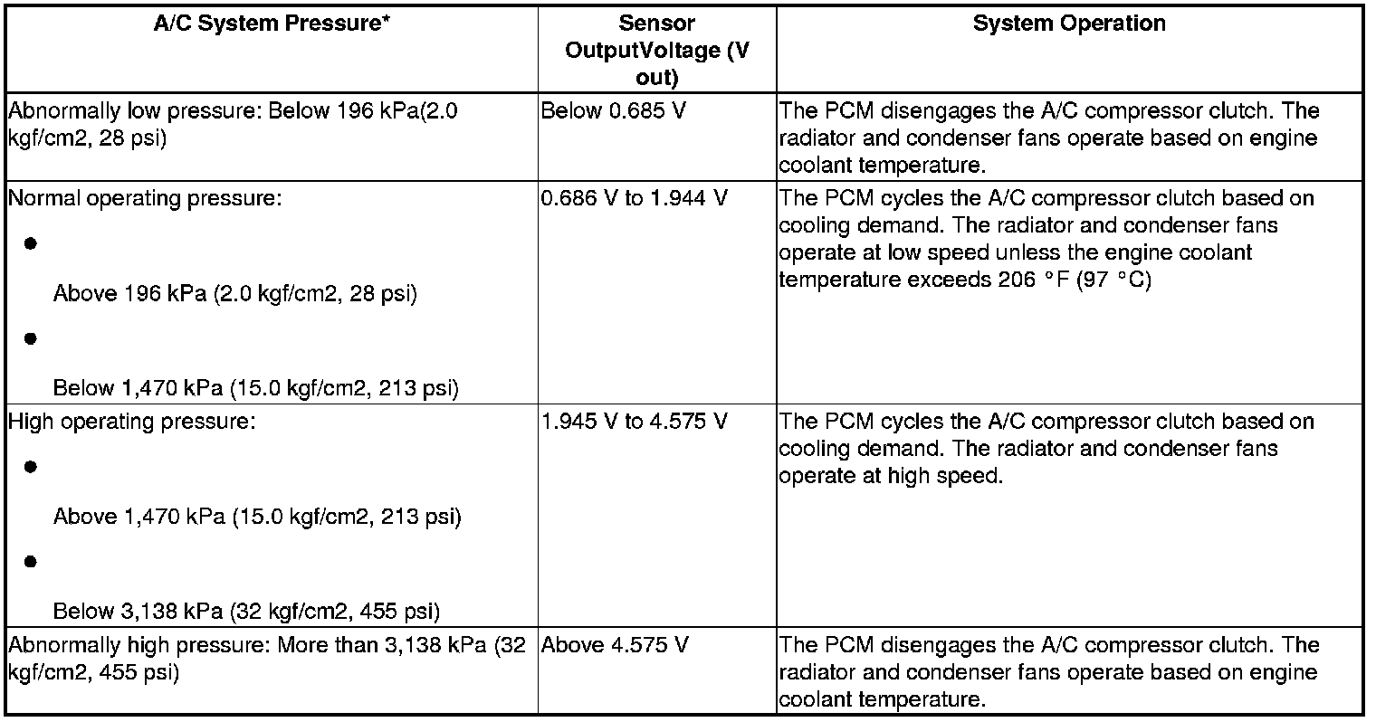 NOTE: When the refrigerant is below 196 kPa (2.0 kgf/cm2, 28 psi) or above 3,138 kPa (32 kgf/cm2, 455 psi), the PCM turns the A/C compressor clutch relay off to protect the A/C compressor. When the refrigerant pressure is above 1,470 kPa (15.0 kgf/cm2, 213 psi), the PCM switches the radiator and A/C condenser fans to high speed.