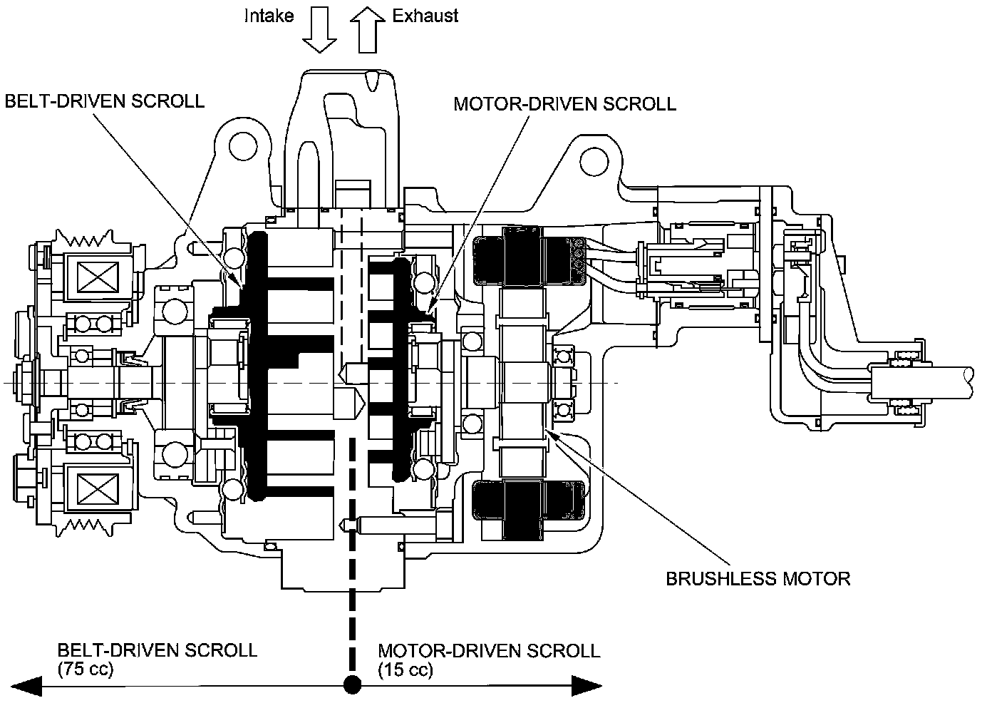 The dual scroll hybrid A/C compressor is a twin chamber dual compressor, that can use both mechanical (belt-driven) and electric power (motor-driven) to compress refrigerant.