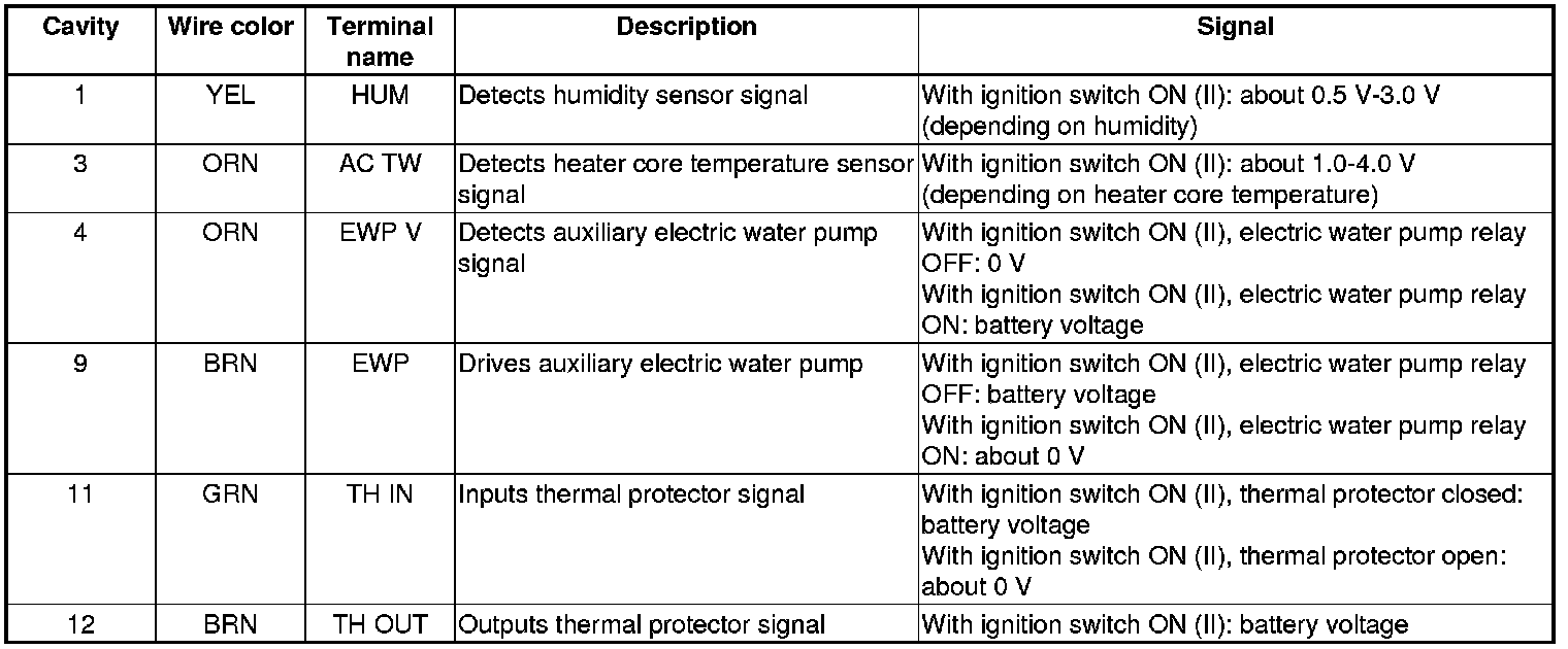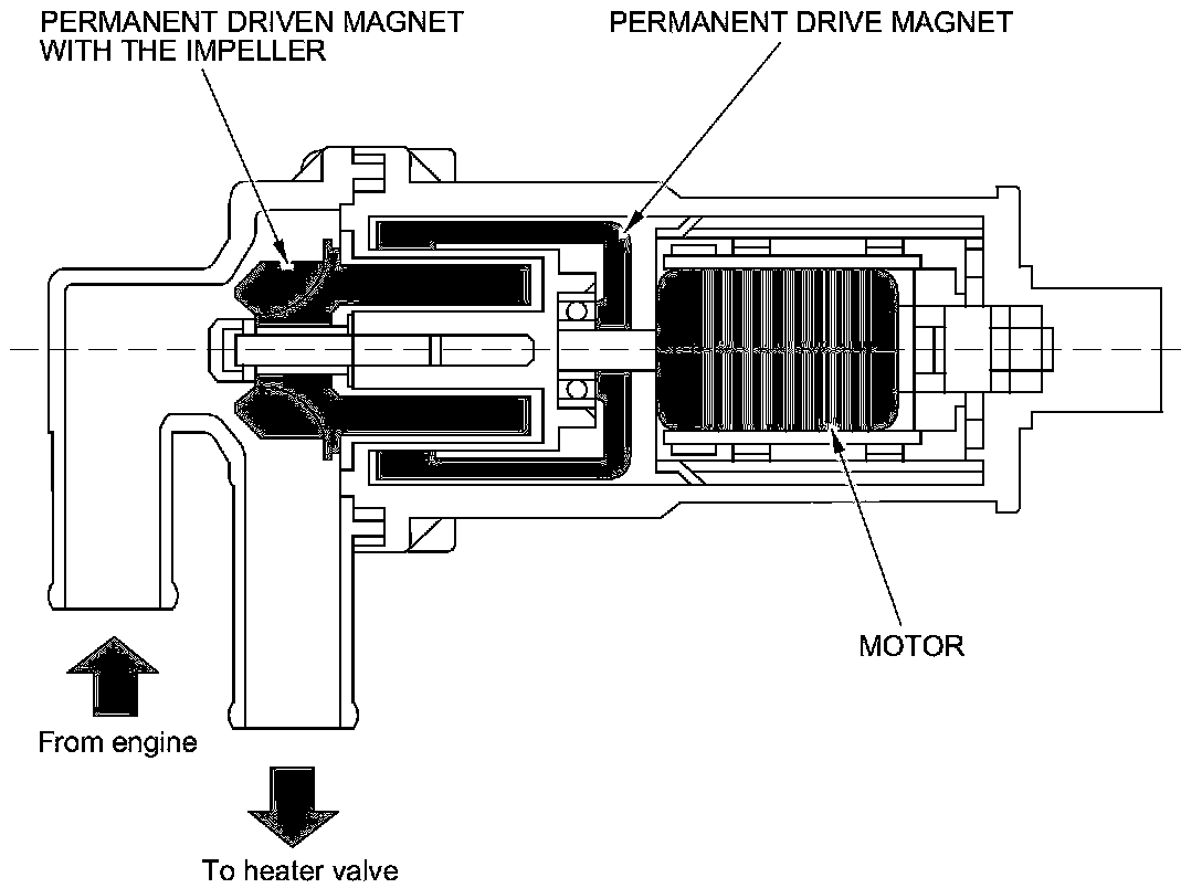 The climate control unit operates the pump, based on an idle stop signal from the PCM. The pump maintains heater temperature during idle stop. However, using hot coolant from the engine will cool the engine. If the ECT temperature drops below a predetermined setting the engine will restart. There is also a temperature sensor located at the heater core. It is used to monitor the auxiliary electric water pump operation. If the pump fails, the temperature sensor detects rapid cooling of the heater core. In addition, the auxiliary electric water pump connector includes a second set of contacts to establish continuity through the connector. If these contacts open, the climate control unit will set a DTC.