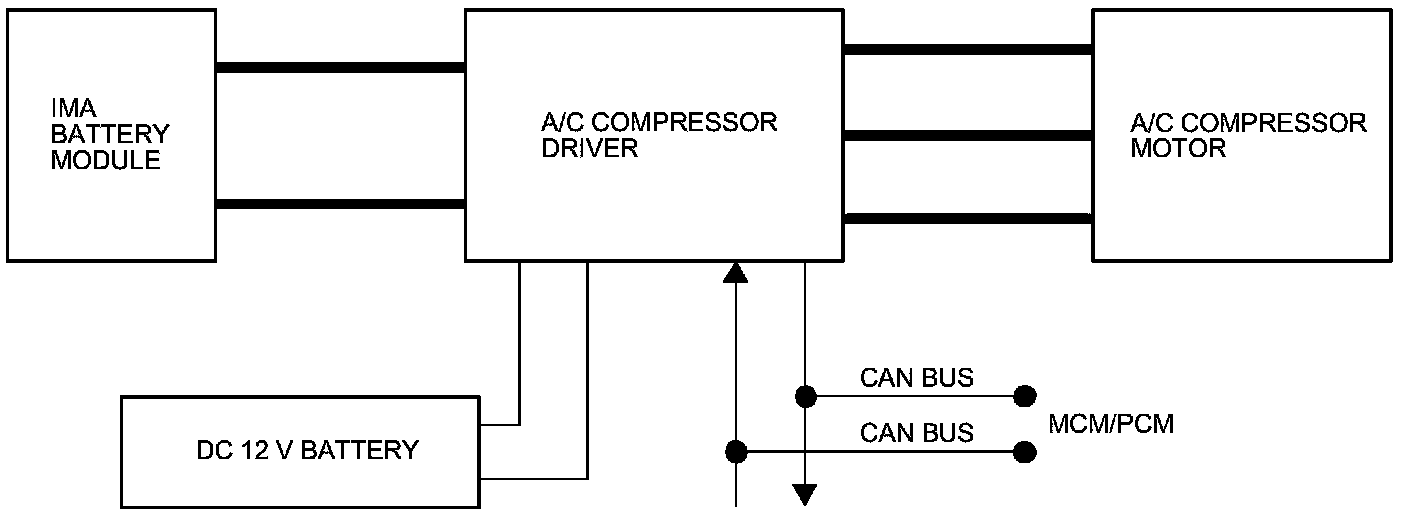 The A/C compressor driver supplies the A/C motor compressor with switched high voltage from the IMA battery module. The A/C compressor driver receives signals from the MCM/PCM and the climate control unit through a CAN Bus, which the compressor driver uses to match A/C compressor speed to the driving conditions and the cooling request. In case of a system failure the A/C compressor driver will communicate a DTC through the CAN Bus. The DTC is displayed through the HVAC and/or the IMA system depending on the failure.