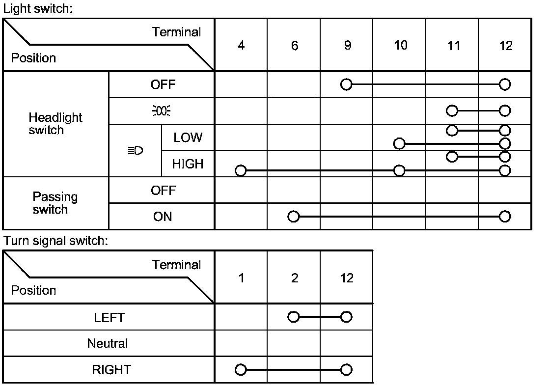 - If the terminals look OK, check for continuity between the terminals in each switch position according to the tables.