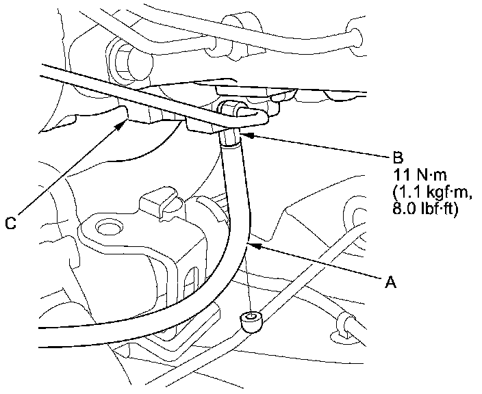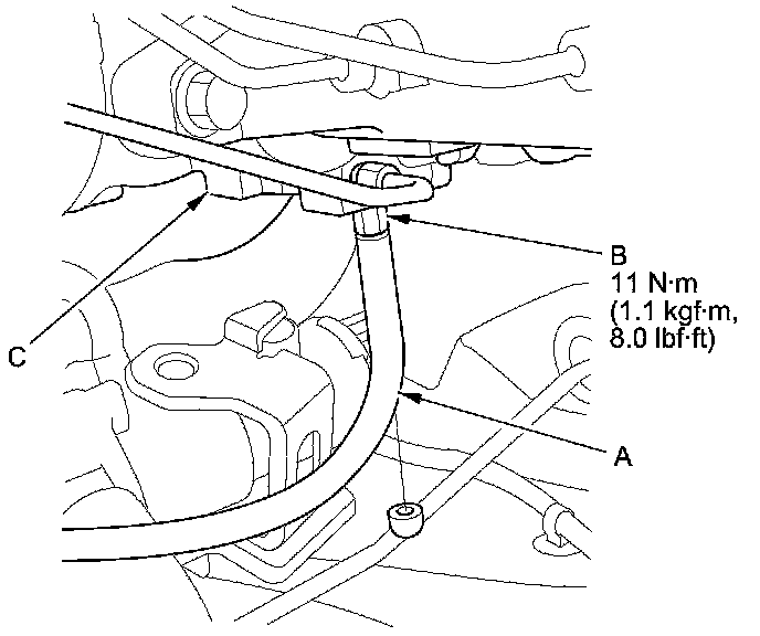 5. Attach a length of clear drain tube (A) to the bleed screw (B) under the servo unit (C), and loosen the bleed screw.
