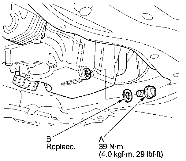4. Reinstall the drain bolt with a new washer (B) and torque to specification.