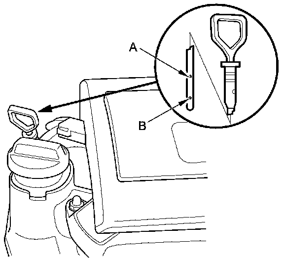 3. Remove the dipstick, and check the engine oil level. It should be between the upper mark (A) and lower mark (B).