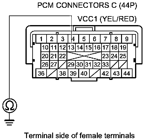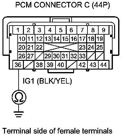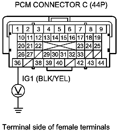 61. Measure the voltage between PCM connector terminal C36 and body ground.