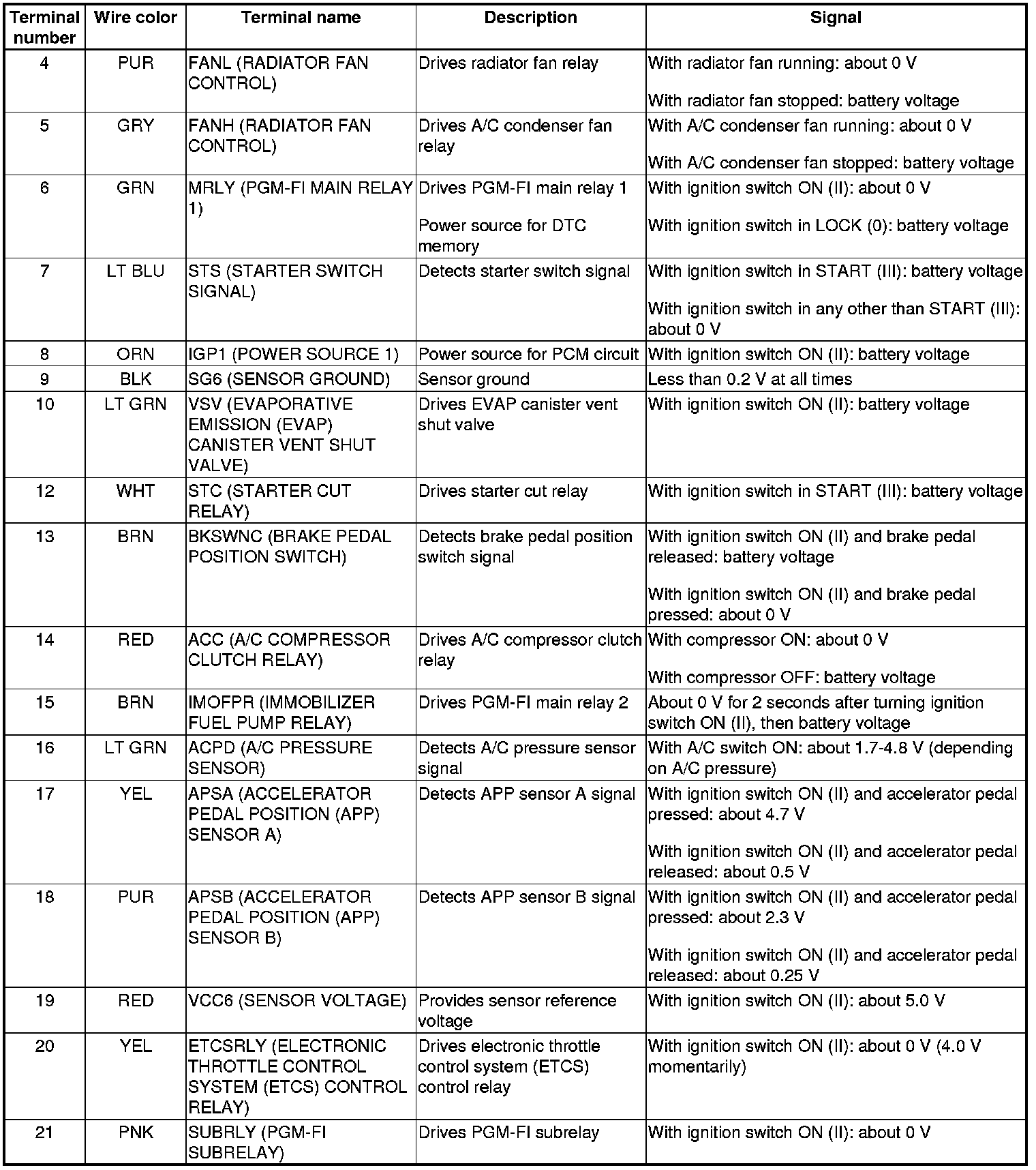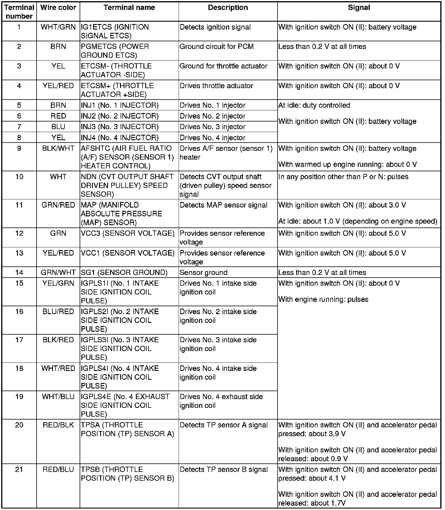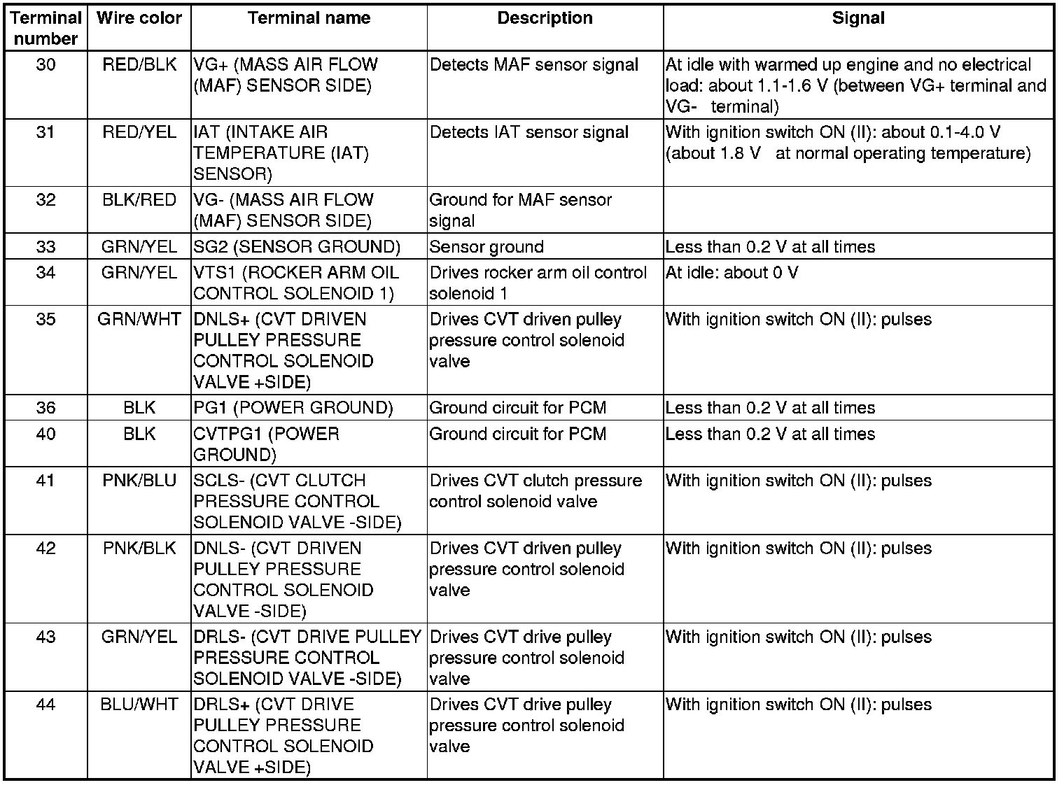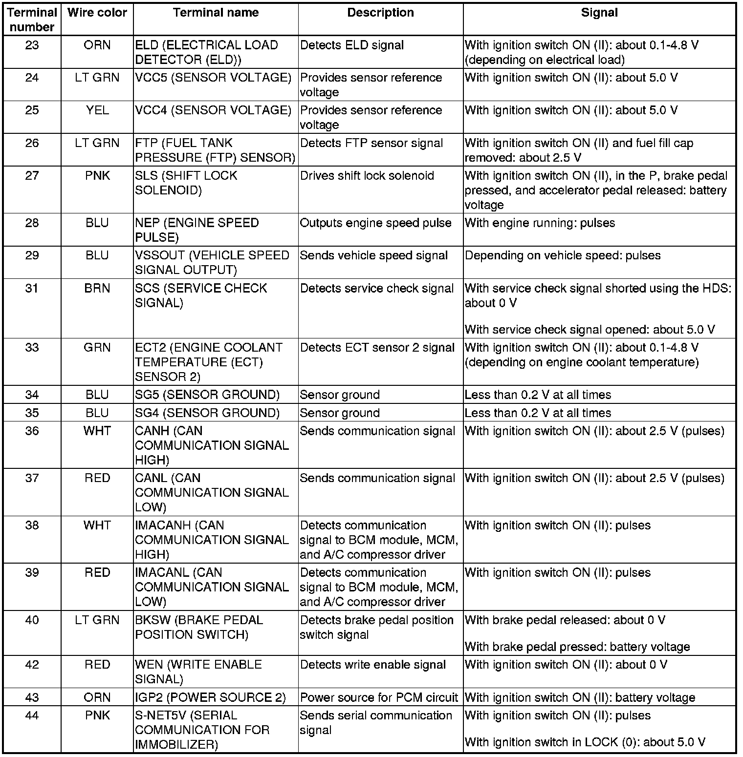 PCM Inputs and Outputs at PCM Connector A (square) (44P)