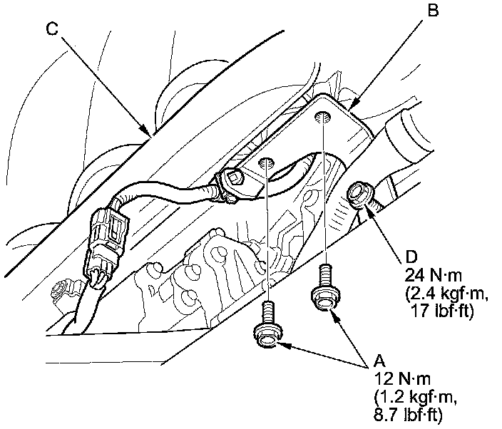 7. Remove the two bolts (A) connecting the intake manifold bracket (B) to the intake manifold chamber (C), and loosen the third bolt (D).