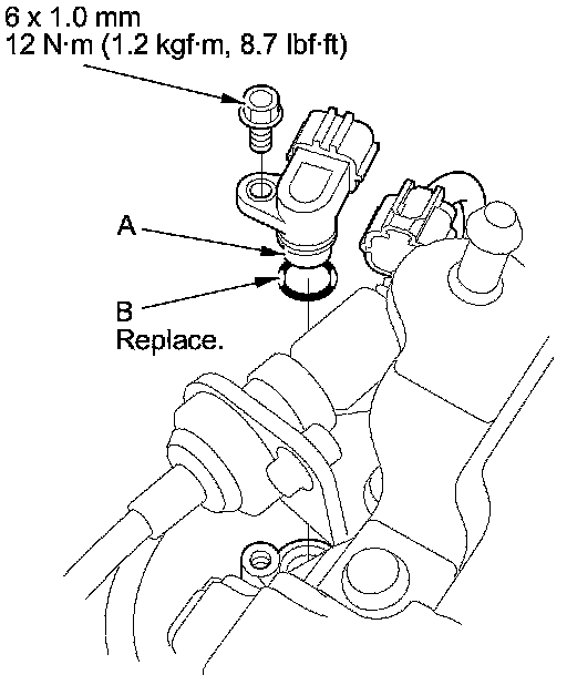 3. Install a new O-ring (B) on a new vehicle speed sensor, then install the vehicle speed sensor in the transmission housing.
