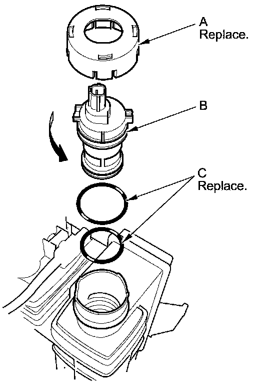 4. Install the parts in the reverse order of removal with new O-rings (C) and a new cap.