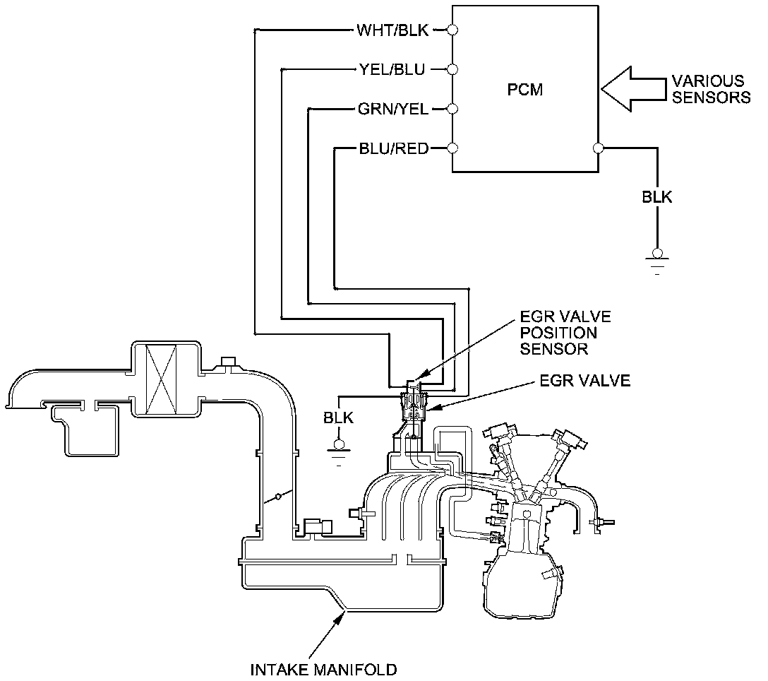 The EGR system reduces oxides of nitrogen (NOx) emissions by recirculating exhaust gas through the EGR valve and the intake manifold into the combustion chambers. The PCM memory contains the ideal EGR valve position for various operating conditions.