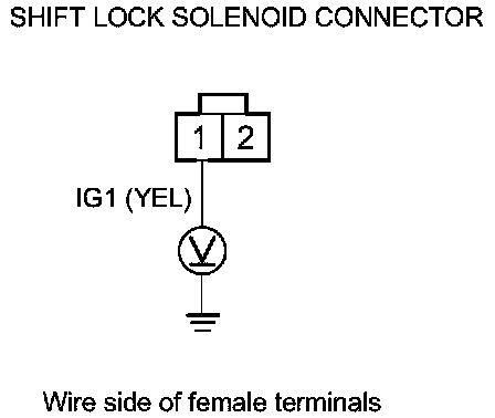 11. Release the brake pedal, and measure the voltage between shift lock solenoid connector terminals No. 1 and No. 2. The shift lever must be in P.