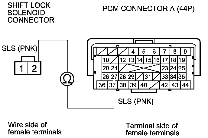 15. Check for continuity between PCM connector terminal A27 and shift lock solenoid connector terminal No. 2.