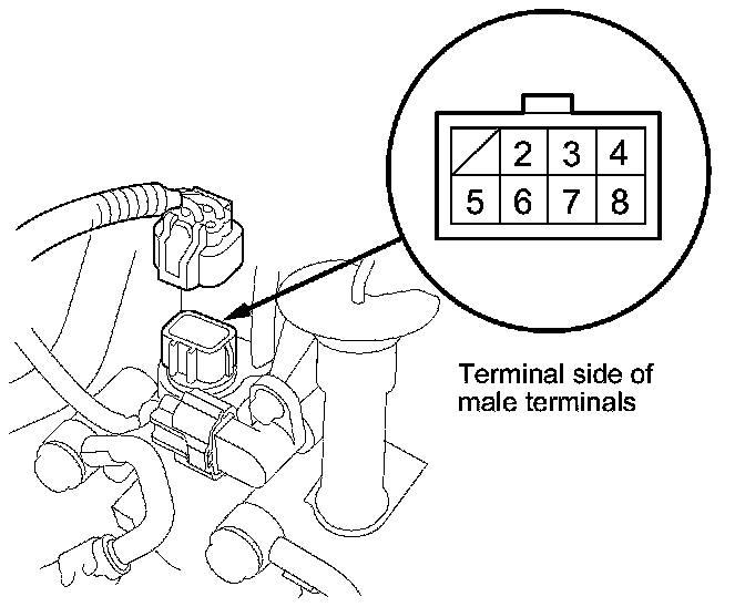5. Connect a jumper wire from the battery positive terminal to solenoid harness connector terminal No. 2, and connect another jumper wire from the battery negative terminal to terminal No. 6. A clicking sound should be heard.