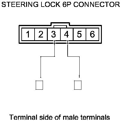 4. Connect power to steering lock connector terminal No. 4, and ground to steering lock connector terminal terminal No. 3. Check that the ignition key cannot be turned to LOCK (0) position. Disconnect power, and check that the key can be turned to LOCK (0) position and removed from the cylinder.
