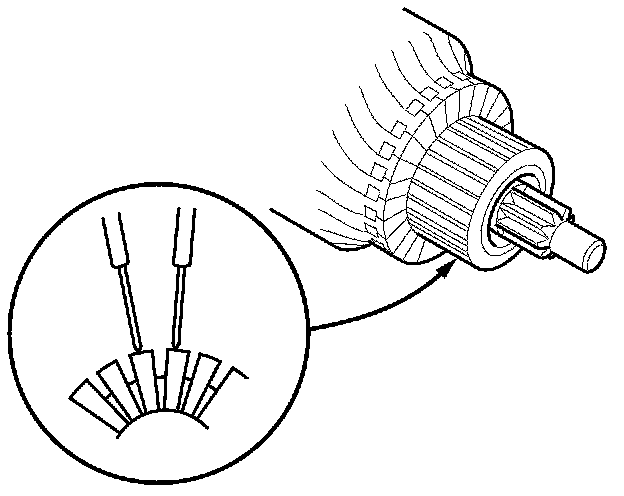 7. Use an ohmmeter to check for continuity between the segments of the commutator. If there is an open circuit between any segments, replace the armature.