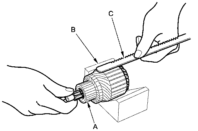8. Place the armature (A) on an armature tester (B). Hold a hacksaw blade (C) on the armature core. If the blade is attracted to the core while the core is turned, the armature is shorted. Replace the armature.