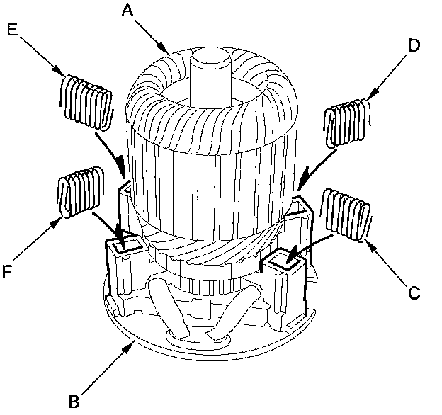 17. While squeezing a spring (C), insert it in the hole on the brush holder, and push it until it bottoms. Repeat this for the other three springs (D, E, and F).