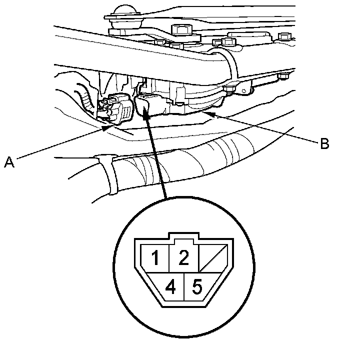 3. Disconnect the 5P connector (A) from the windshield wiper motor (B).