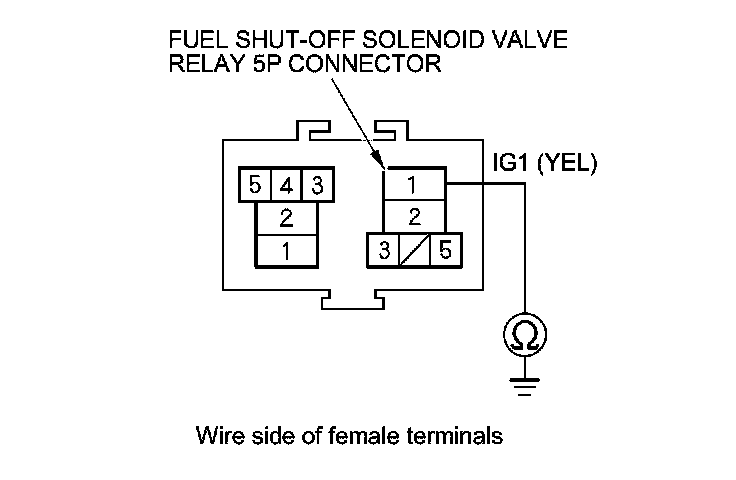 48. Check for continuity between fuel shut-off solenoid valve relay 5P connector terminal No. 1 and body ground.