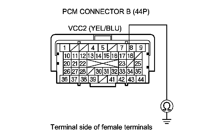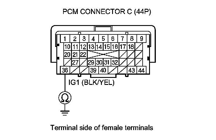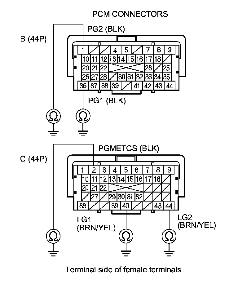 68. Check for continuity between body ground and PCM connector terminals B1, B36, C2, C40, and C44 individually.