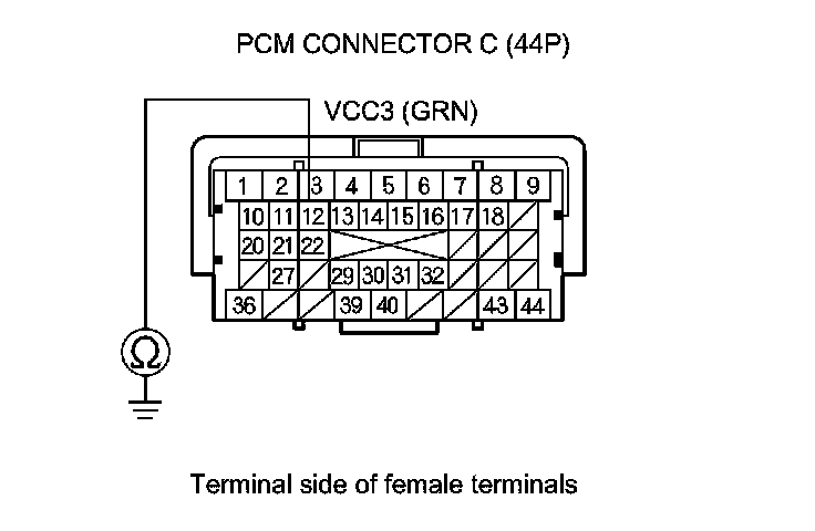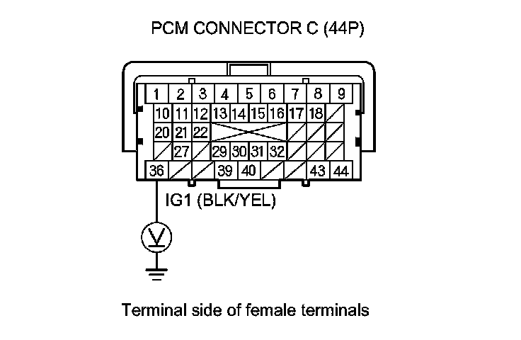 54. Measure the voltage between PCM connector terminal C36 and body ground.